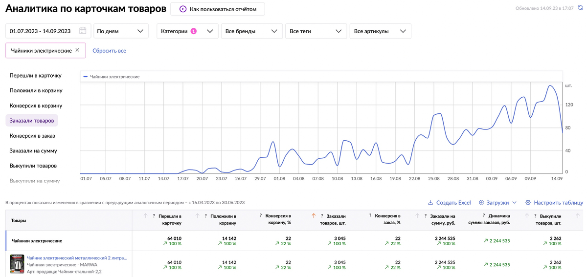 Товар – электрический чайник. Был выведен в продажу 17 июля и продвигается по этот день. Средняя цена колеблется в районе 500-700 руб. На графике период ДО рекламы сравнивается с аналогичным периодом ВО ВРЕМЯ рекламы с 1 июля по 14 сентября. За 2 месяца получено: Переходов в карточку: 64 010 (рост на 100%) Добавлений в корзину: 12 142 (рост на 100%) Заказов: 3 045 (рост на 100%) Сумма заказов в рублях: 2 244 535 (рост на 100%) Потрачено всего: 519 610.28 руб. ДРР = 519 610.28 /2 244 535 * 100 = 23% Итого за 2 месяца рекламы потрачено: 519 610 руб. ДРР = 23% Динамика суммы заказов показывает, что благодаря рекламе сумма заказов выросла на 2 244 535 руб. Наша целью был рост по самой высокочастотной фразу "чайник электрический". По скриншоту видно, что цель была достигнута. Я продолжила работать с данным селлером и этим товаром, так что возможно подобью итоги по результатам полугода/года. Вы его уже нашли 👩💻 Работаю как сотрудник на постоянной основе, а так же помогу, если нужен свежий