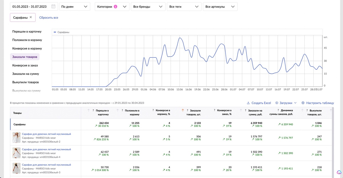 Начали сотрудничество в конце апреля, чтобы успеть раскачать карточки товара до летнего сезона 🌴 Цель была проста - ворваться в топ с тремя популярными расцветками и распродать все до конца сезона. Продавали классные дизайнерские сарафаны для детей на лето. Мой клиент заказывает лучшие ткани, отшивает на проверенном производстве, по уникальным фасонам. Действительно качественный товар и на мой вкус очень красивый! Стартовая цена была около 2400-3000 рублей. В то же время большинство конкурентов продавало свои сарафаны за 1500 и даже меньше - некоторые даже менее 1000 рублей. Но лишь несколько конкурентов предлагали сарафаны по схожим ценам. Но, несмотря на это, смогли достаточно быстро попасть на первую страницу по самым популярным запросам, а сарафаны покупали еще и дороже рынка. Все это возможно, если одежда действительно уникальная и полностью отвечает вкусам потенциального покупателя по дизайну, тканям и фасону. Для начала посмотрим на динамику заказов