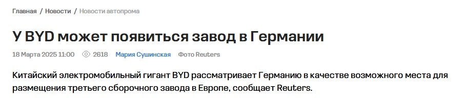 Производство на заводе BYD в Венгрии должно начаться уже в октябре 2025, а завод в Турции должен быть введен в эксплуатацию в марте 2026 года. Третий завод (видимо, в Германии) заработает еще примерно на год позже.
