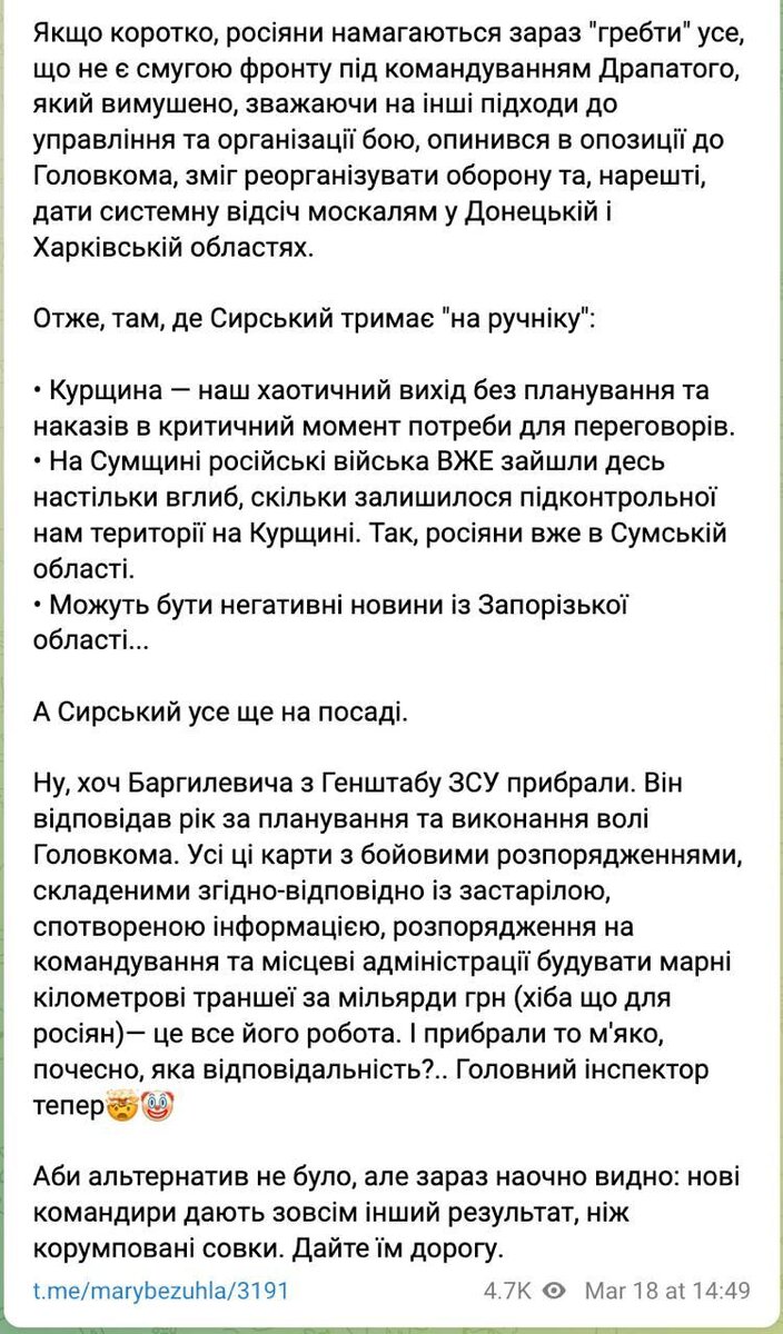 Депутат Верховной Рады Украины Марьяна Безуглая сообщает о продвижении российских войск в Сумской области. Она утверждает, что они уже зашли на подконтрольные Украине территории. «На Сумщине российские войска уже зашли где-то настолько вглубь, сколько осталось подконтрольной нам территории на Курщине. Да, россияне уже в Сумской области. Могут быть отрицательные новости из Запорожской области», - пишет Безуглая. Нардеп имеет в виду наступление российских войск у Пятихаток и Щербаков на Ореховском направлении. По ее логике, если в Курской области ширина плацдарма ВСУ составляет 8 км, то российская армия зашла в Сумскую область примерно на то же расстояние. Серая зона сейчас - вплоть до Басовки. Это означает, что за эти территории идут бои, и ни одна из сторон пока не может закрепиться. Однако вывод один - если ВС РФ возымеют тактический успех в Сумской области, это станет прямым путем к Запорожью. В провалах на фронте Безуглая обвиняет главкома Сырского, считая, что его действия могут пр