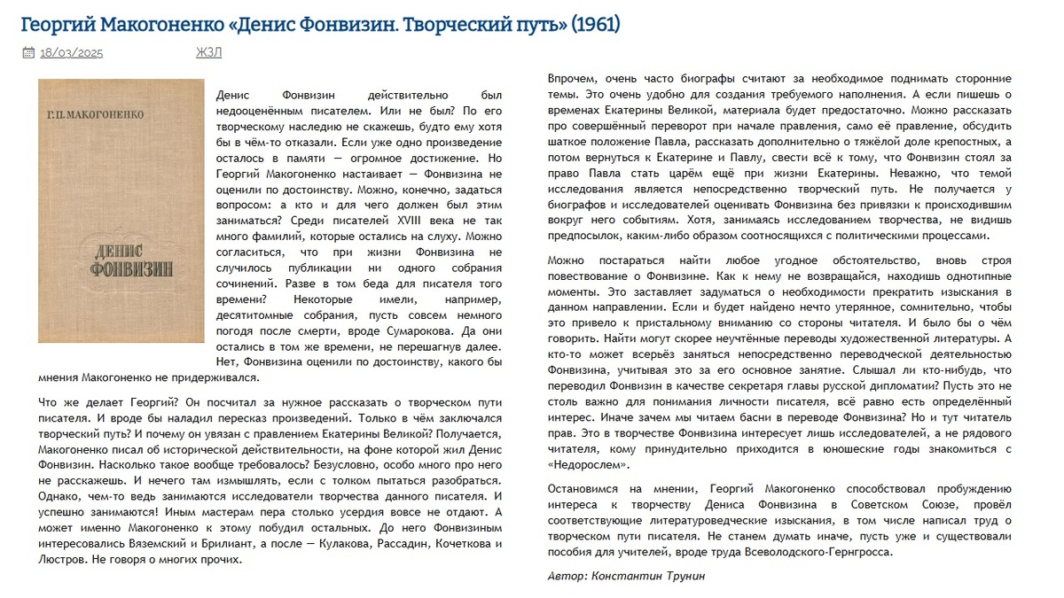 Георгий Макогоненко «Денис Фонвизин. Творческий путь» Критика