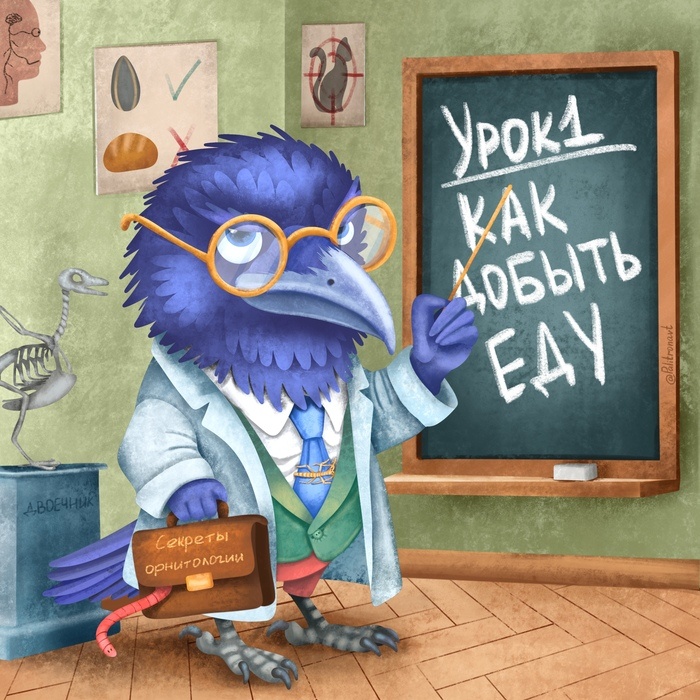 Добро пожаловать на курс выживания для птиц! Наш ведущий - ворон-профессор Орни, знаток пернатой жизни. В серии уроков он расскажет на примерах, как правильно добывать еду, строить отношения и не пасть в лапы хищника. Всем карр! Сегодня я научу вас, как не остаться голодным в этой сложной, но удивительной жизни! Первое правило птичьей смекалки: еду нужно не только искать, но и добывать хитростью. Глава первая: Инструменты не только для людей. Возьмём Галапагосских вьюрков. Эти умнички догадались, что палочка - это не просто палочка, а ключ к сытному обеду. Они ловко используют веточки, чтобы вытаскивать насекомых из-под коры деревьев. Настоящие первобытные пернатые! Глава вторая: Строим ловушки. А вот совы - не только мудрые создания, но и хитрые стратеги. Они собирают мышиные шкурки и укладывают их в гнездо, создавая уютное заманчивое убежище для будущего обеда. Думаете, это просто уютный интерьер? Ага, конечно, карр! Глава третья: Городские технологии. Что делать, если ты живёшь в ка