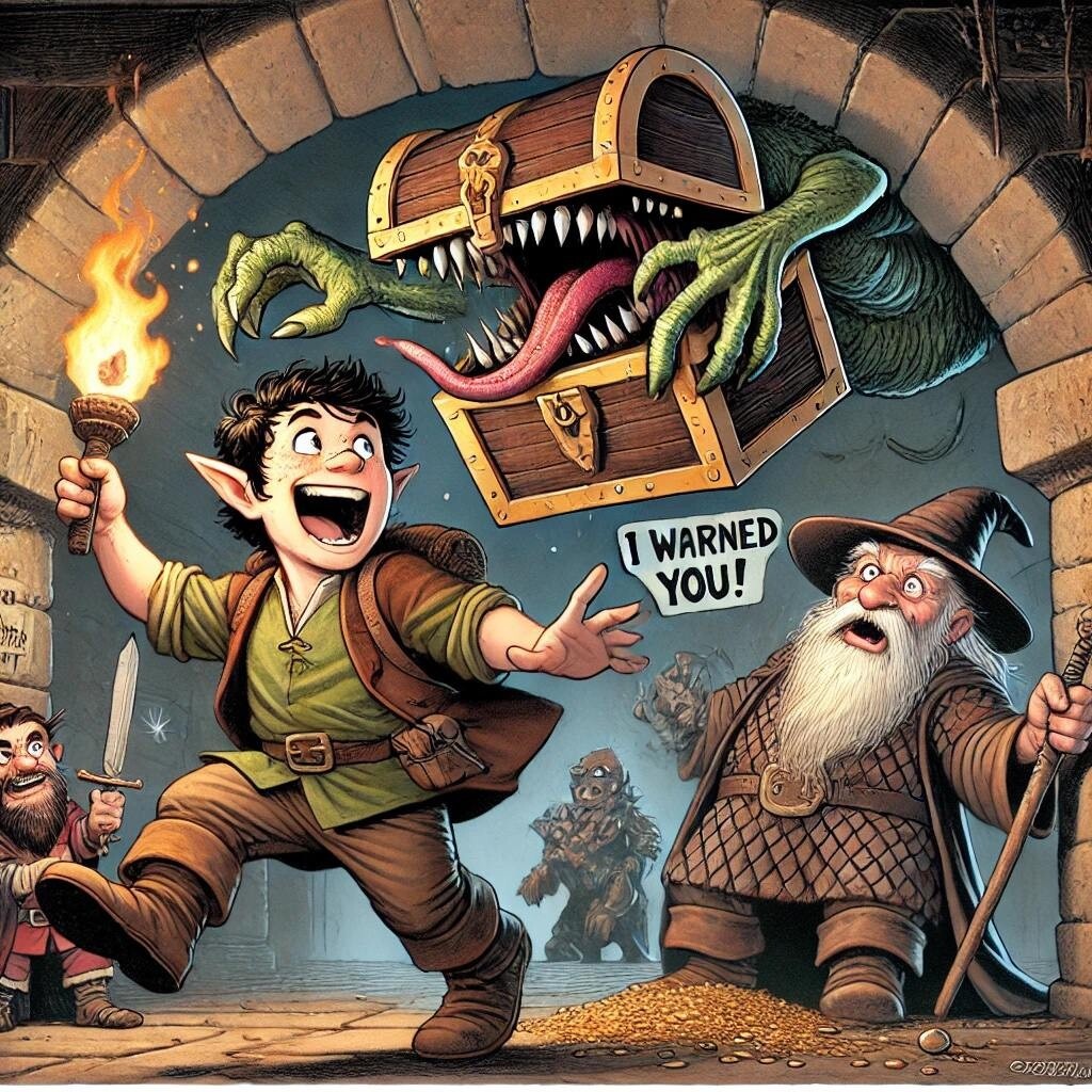 Если в обычных играх сундук — это коробка с сокровищами, то в Dungeons & Dragons это коробка с проблемами, потому что здесь доверие к безобидным на первый взгляд предметам может оказаться фатальным. Паранойя? Нет, инстинкт самосохранения. Самая главная причина — мимики. Эти ребята могут прикинуться чем угодно, но чаще всего принимают форму сундуков, дверей, кресел и даже кроватей. Ещё бы, кто заподозрит в удобном стуле смертельную угрозу? Вы заходите в комнату, видите сундук, радуетесь находке… а потом сундук радуется вам и пытается съесть. 🎭 Пример из игры: В одной кампании игроки приручили мимика и решили использовать его как переносной сейф. Он был идеальным хранилищем — до тех пор, пока не начал считать золото не ценностью, а обедом. В итоге персонажи остались без денег, но обрели упитанного питомца. 🔹 Вывод: Прежде чем поживиться содержимым сундука, убедитесь, что сундук не планирует поживиться вами. Вам кажется, что перед вами сундук, полный сокровищ? Отлично! Теперь задайте се