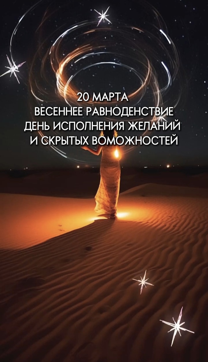 В этом году фантастическая энергия Весеннего Равноденствия поможет ВОПЛОТИТЬ ВАШИ ЖЕЛАНИЯ В РЕАЛЬНОСТЬ. Потому что эта энергия придет в коридоре Затмений! Следующий такой день будет только в 2032 году! Очень мощный энергетический день, который важно провести правильно. Раньше его называли днем Исполнения Желаний) Это когда день по продолжительности равен ночи, и энергии Инь и Ян сбалансированы. Пик 20 марта в 12:01 по мск. Но Весеннее равноденствие – это не только один день, энергии трансформации будут действовать с 19 по 25 марта. Это период обновления и заложенные энергии будут на вас влиять в течении следующего полугода. Настоятельно рекомендую до 20 марта убраться энергетически и физически в своем доме и на рабочем месте, избавиться от ненужных вещей. Также в эти дни желательно мириться и оставлять все обиды в прошлом. ❌ Что нельзя делать в день Весеннего Равноденствия: • Конфликтовать, сквернословить. Не позволяйте втягивать вас в выяснение отношений, избегайте негативных мыс
