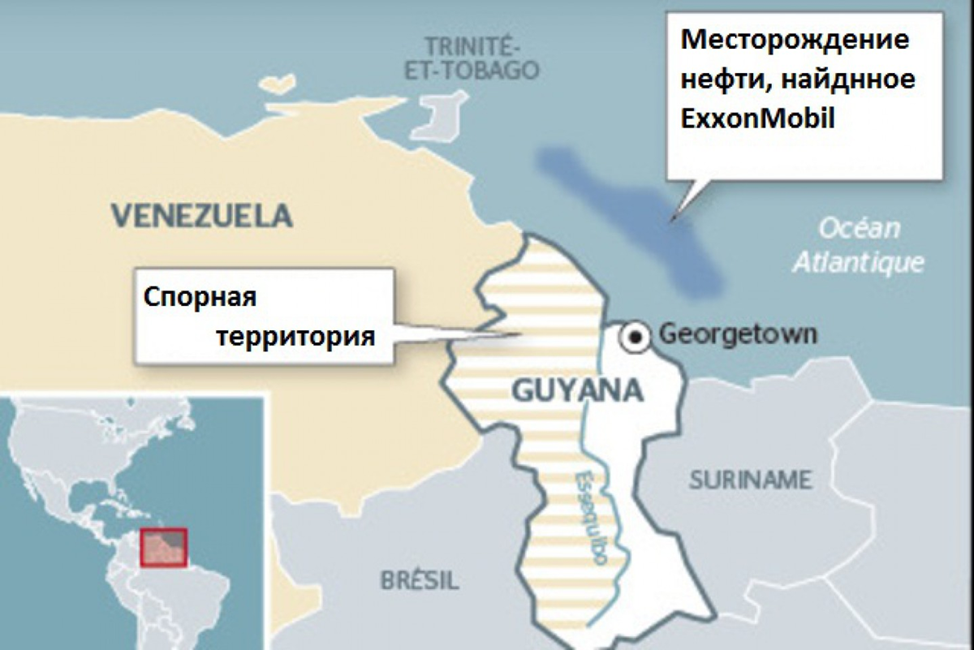 Первая – это претензии Николаса Мадуро на Эссекибо – богатый район Гайаны, который Венесуэла считает незаконно отторгнутым. Шельф Эссекибо – один из самых, если не самый, перспективный в мире район нефтедобычи, которую ведёт американская ExxonMobil. Мадуро не только объявил Эссекибо провинцией Венесуэлы – он не исключил применения военной силы для его присоединения. В район нефтепромыслов периодически проникают венесуэльские военные корабли, а на границе двух стран уже произошло несколько перестрелок.