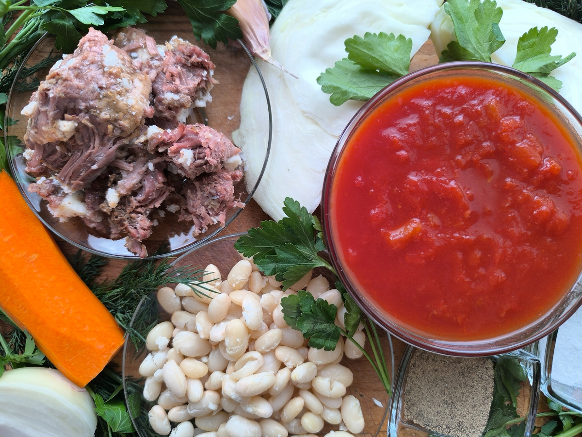 Продукты, которые понадобятся для приготовления щей: тушёнка из говядины ( из расчёта одна банка на два литра щей), вареная фасоль ( я вымочила и сварила фасоль заранее), банка резаных помидоров или томатная паста, средняя морковь, луковица, капуста свежая, зубчик чеснока, зелень, соль, перец, сметана для заправки. По желанию можно добавить болгарский перец, или квашеную капусту вместо свежей, сушёные овощи... В общем щи -- обширное поле творчества.