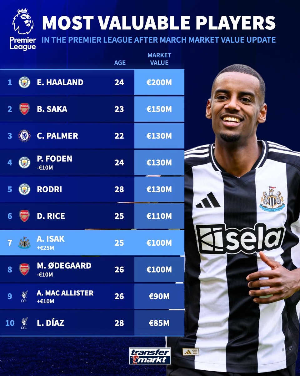 Пока клубный футбол стоит на паузе из-за матчей сборных, портал Transfermarkt провел очередное обновление трансферной стоимости футболистов Премьер-лиги. Общая стоимость игроков английского первенства увеличилась на 79,05 млн евро и теперь составляет 11,82 млрд евро. Главным бенефициаром обновления стал Александер Исак – его стоимость возросла с 75 до 100 млн евро. В мире лишь четыре нападающих оцениваются минимум в 100 млн евро: Эрлинг Холанд (200 млн), Килиан Мбаппе (160 млн), Лаутаро Мартинес (110 млн) и теперь Исак (100 млн). В рейтинге самых дорогостоящих игроков АПЛ Александер занял седьмую строчку. На 25 млн также подорожал Итан Нванери, 17-летняя звездочка «Арсенала» теперь оценивается в 55 млн евро. Немного отстал Дин Хейсен, подорожавший на 24 млн евро. Замыкают пятерку игроков, показавших самый большой рост рыночной стоимости, новички «Ман Сити» – Абдукодир Хусанов (+23 млн евро) и Нико Гонсалес (+22 млн евро). Игроки, чья трансферная стоимость выросла после мартовского обно