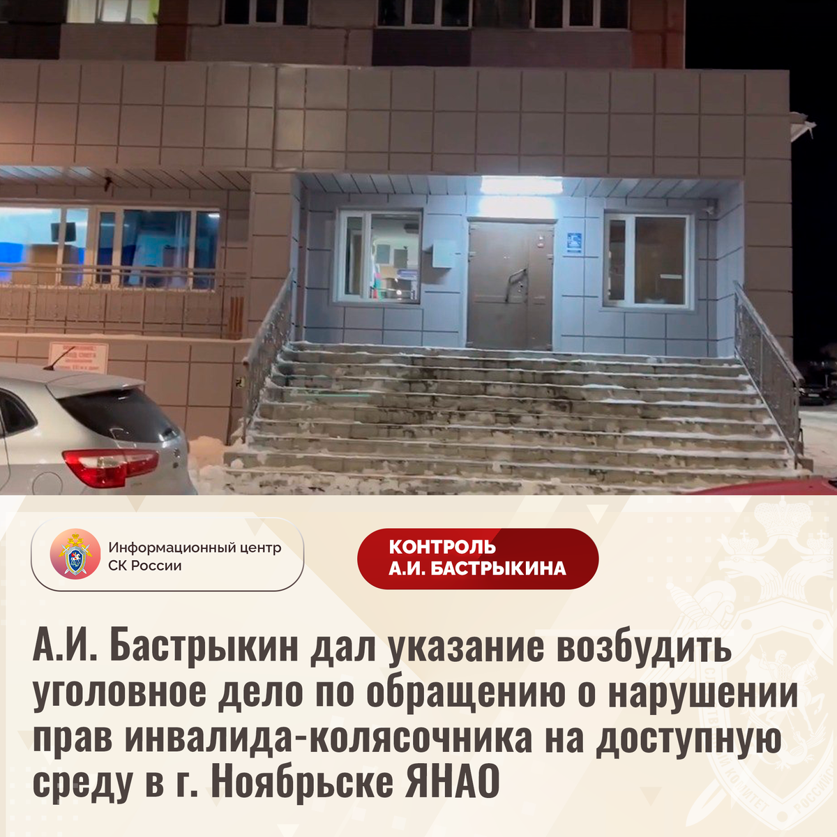 А.И. Бастрыкин дал указание возбудить уголовное дело по обращению о нарушении прав инвалида-колясочника на доступную среду в г. Ноябрьске ЯНАО В комментариях в аккаунте Информационного центра СК России «ВКонтакте» обратилась жительница города Ноябрьска Ямало-Ненецкого автономного округа по вопросу продолжающегося нарушения прав ее 86-летнего супруга, являющегося инвалидом-колясочником и имеющего статус «дитя войны». Семья проживает в многоквартирном доме на проспекте Мира, на первом этаже которого девять лет назад было размещено учреждение. В связи с этим доступ жильцов к лифту был ограничен, они вынуждены использовать запасной вход в здание, необорудованный пандусом. В результате пенсионер не имеет возможности покинуть жилье. Многочисленные обращения результатов не принесли. Решение суда, вынесенное в прошлом году и обязавшее администрацию предоставить инвалиду жилое помещение, соответствующее его нуждам, до настоящего времени не исполнено. Ранее ситуация освещалась в социальной сети.