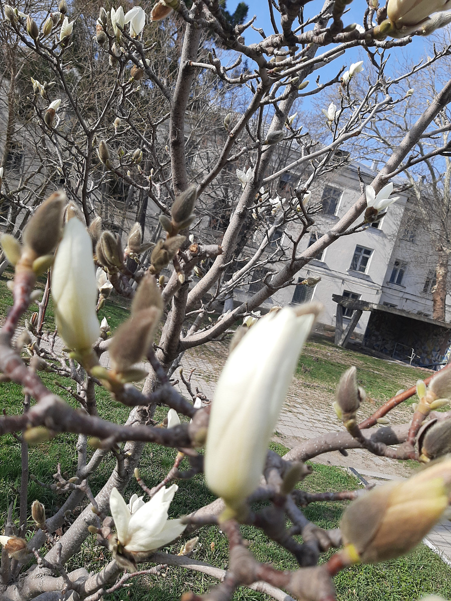 Так что я за то, чтобы те, кому довелось родится в более северных широтах, тоже смогли увидеть прелесть цветущих деревьев своими глазами, и не бродили по городу в надежде наткнуться на что-то случайно. Кстати, магнолии посажены и ещё в некоторых местах - в Императорском (то бишь, Черноморском парке), может через пару лет мы будем любоваться ими и там.