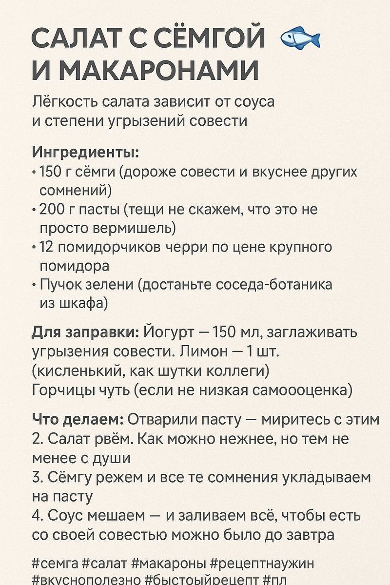 🍝 САЛАТ С СЁМГОЙ И МАКАРОНАМИ Когда сёмга была, макароны остались, а вдохновение пришло — и ты шеф-повар на кухне-студии в хрущёвке! Ингредиенты: 200 г малосольной сёмги — изыск и бюджет одновременно 200 г макарон — можно даже бантики, ты ведь романтик 2 огурца — свежо и зелено 2 яйца — классика ½ луковицы — слёзы не по эксу, а по рецепту Для соуса: 3 ст. л. кетчупа — чтобы было весело 3 ст. л. майонеза — чтобы было вкусно 1 ст. л. лимонного сока — чтобы было пикантно Перец — чтоб оживить скуку Что делать: 1. Макароны отвари, остуди, не спеши — как в отношениях. 2. Всё порежь, сложи, перемешай. 3. Соус замешай с азартом. 4. Оставь в холодильнике на пару часов, пусть настоится... как хорошее оправдание. #салат #макароны #семга #рецептдня #ужин #вкусноибюджетно #домашняяеда #приколынакормежке