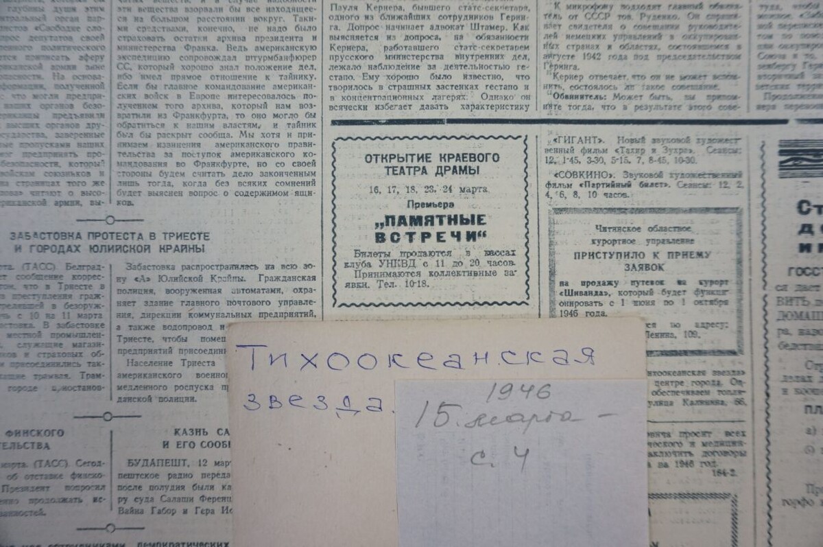 Из Москвы прибыло необходимое оборудование для сцены и технических цехов, которое быстро смонтировали, и набранные в труппу артисты приступили к репетициям. А на страницах газеты «Тихоокеанская звезда» (16+) появилась первая театральная афиша — объявление о том, что 16 марта спектаклем по пьесе К. Утевского «Памятные встречи» (16+) открывается Краевой театр драмы. Неудивительно, что спектакль был посвящен героям Великой Отечественной войны — в зале сидели те, кто бил врага на фронте, и те, кто трудился в тылу на благо Победы.