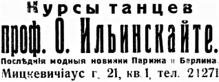 Lietuvos aidas [летувос айдас], 1940, 21 апреля: Устав от умственной или другой работы, вы восстановите силы, танцуя прекрасный вальс или другие танцы. Грациозно танцевать вы научитесь, если запишитесь на курсы танцев к проф. О. Ильинскайте.