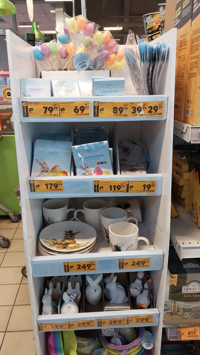 Всем привет, мои дорогие друзья, подписчики и гости моего канала.В Пятерочке товары к Пасхе. Магазин находится по адресу Ростовская область, Зерноградский район, станица Мечётинская, улица Ленина, 62. Декорация пасхальная Seasons в наборе в ассортименте, 3 шт. цена со скидкой по карте 69.99 руб. Наклейки Seasons 3D для декорирования яиц, 1 шт. цена со скидкой 39.99 руб. Наклейки Seasons для декорирования яиц в ассортименте цена со скидкой 29.99 руб. Набор пасхальный Seasons Радуга для творчества в ассортименте 1 шт. цена со скидкой 179.99 руб. Набор пасхальный Seasons Мраморный для творчества в ассортименте 1 шт. цена со скидкой 119.99 руб. Термонаклейки Seasons для декорирования яиц в ассортименте 1 шт. цена со скидкой 19.99 руб. Тарелка Seasons в ассортименте, фарфор, цена со скидкой 249.99 руб. Кружка Seasons в ассортименте, фарфор, 1 шт. цена со скидкой 249.99 руб. Тарелка Seasons для кулича и яиц в ассортименте, цена со скидкой 179.99 руб. Корзина Seasons в ассо