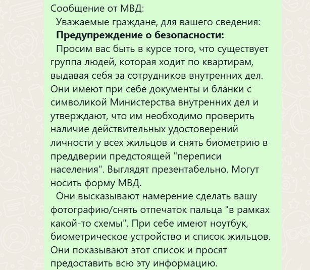 Уже несколько дней из каждого утюга, но прежде всего в Вотсапе (!): «Сообщение от МВД, предупреждение гражданам! Внимание! Будьте бдительны!» Писать текстом не буду, не хочу распространять лишний раз сомнительную информацию — а на картинке тексты вроде бы до сих пор не индексируются и в поиск не попадают. Вот такое сообщение из нашего домового чатика: Граждане-товарищи, я сама всеми руками и ногами за то, чтобы людей предупреждать и информировать о мошеннических схемах. Я их собираю и вам о них рассказываю. Информировать -- это важно и правильно. НО НЕ ЗАПУГИВАТЬ! А это сообщение — чистой воды пугалка, чтобы, как говорил товарищ Гоцман, «сделать нервы». Нам всем! Во-первых, дорогие друзья, с каких пор у нас МВД пользуется Вотсапом для информирования населения? — Правильный ответ: МВД Вотсапом в принципе не пользуется. Ни для каких целей. Во-вторых, история эта с бородой, и МВД опровергало такие страшилки-пугалки еще в 2024 году. Вот посмотрите, несколько примеров опровержений: Кто не