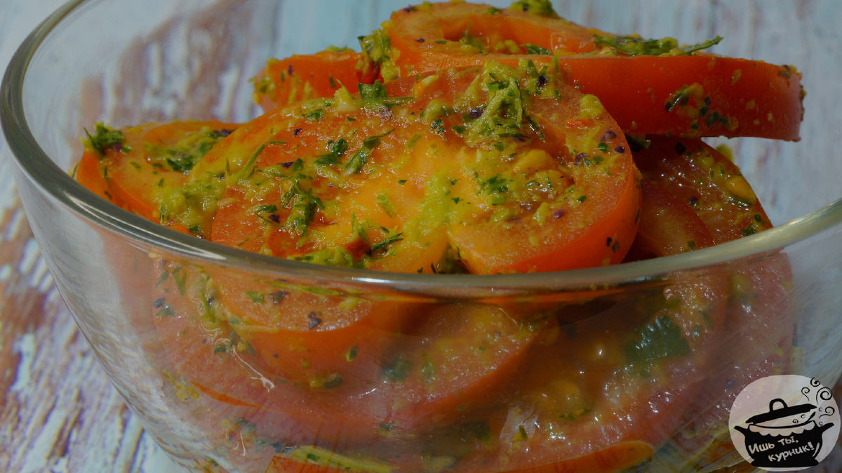 Ингредиенты: · помидоры – 1 кг.; · чеснок – 1 головка4 · перец чили – 1 шт.; · базилик – 1 ст.л.; · укроп, петрушка – по 1 пучку; · масло раст. – 70 мл.; · уксус – 50 мл.; · соевый соус – 2 ст.л.; · сахар – 50 гр.; · соль – 10 гр. Приготовление: помидоры порезать колечками. Перец, зелень, чеснок, масло, уксус, соевый соус соединить и перебить блендером д о однородной массы, смешать маринад с помидорами, добавив соль и сахар. Дать настояться в холодильнике ночь. Приятного аппетита!