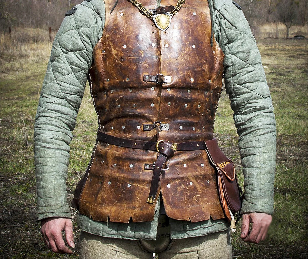 Другое важное применение кожи — окантовка и отделка металлических доспехов. Края пластин и кольчуг часто обшивались кожей для предотвращения натирания и повреждения одежды или кожи воина. Это было особенно важно в местах, где доспех контактировал с шеей, запястьями или другими уязвимыми участками тела.