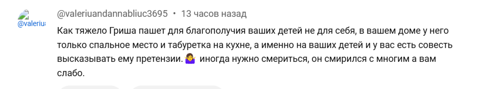 Как тяжело Гриша пашет для благополучия ваших детей, не для себя, в вашем доме у него только спальное место и табуретка на кухне, а именно на ваших детей, и у вас есть совесть высказывать ему претензии. Иногда нужно смириться, он смирился с многим, а вам слабо.