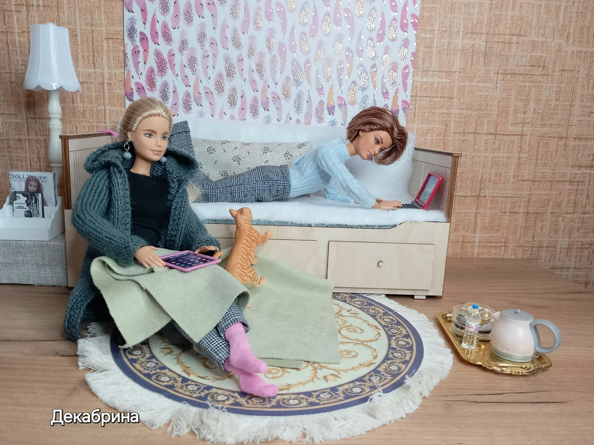 Здравствуйте, друзья! Не думайте, что я забыла про кукол, просто хочу на короткое время уменьшить число статей про них, хочу дать себе соскучиться. Это полезно и не только с куклами. Буду показывать что-то, но не часто. Надеюсь, что друзья сохоббиты не уйдут с моего канала...😘👍 Итак, что же у нас сегодня? Решила подсмотреть, как Эмилия и Саша работают над книгой. В этот раз они пишут цикл рассказов для детей начальной школы. Цель- заинтересовать ребят событиями, что бы им захотелось читать! Мила села на ковёр около дивана с планшетом. Накрыла ноги пледом. Саша легла на диван. Ей нужны более комфортные условия. Шарлотта захотела запрыгнуть к хозяйке, но девушка была задумчива и не заметила любимую рыжулю. Тогда кошка переместилась и подлезла под руку Саши. Наконец, Саша поменяла положение и села, а Шарлотте того и надо! Муррр, замурчала любимица... Мила посмотрела на эту влюблённую парочку и решила пересесть...на диван. Работа над рассказами у подруг двигалась, но никак не находил