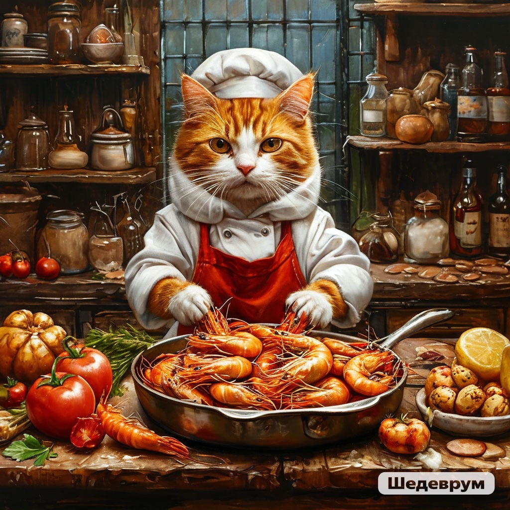 Рыжий кот на кухне — это не просто забавный образ, а целая история, полная кулинарных приключений и неожиданных поворотов. Представьте себе, как он, с грацией истинного шеф-повара, уверенно шагает по кухонному пространству. На его мордочке играет довольная улыбка, а в глазах сверкает азарт. Сегодня он решил порадовать своих друзей из соседнего двора необычным блюдом — свежими королевскими креветками. Кот подходит к холодильнику и открывает его, обнюхивая воздух в поисках идеальных ингредиентов. Он достаёт пакет с королевскими креветками, которые только что привезли из моря. Кот знает: чтобы сделать это блюдо по-настоящему вкусным, нужно правильно замариновать креветки. Он берёт лимон и начинает срезать с него кожуру, аккуратно выжимая сок в глубокую миску. Запах цитрусовых наполняет кухню, и коту становится ещё веселее. Затем он добавляет в миску щепотку соли, перца и немного острого соуса для пикантности. Кот ловко перемешивает все ингредиенты, представляя, как его друзья будут насл