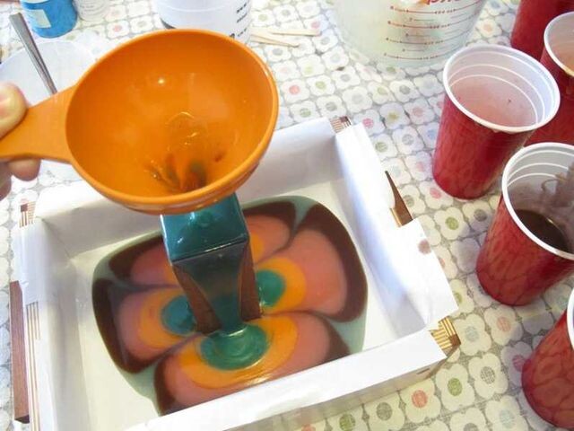 Первым делом растапливается основа. Затем в нее добавляются масла и красители, а уже потом жидкое мыло разливается по формам и ставится застывать.