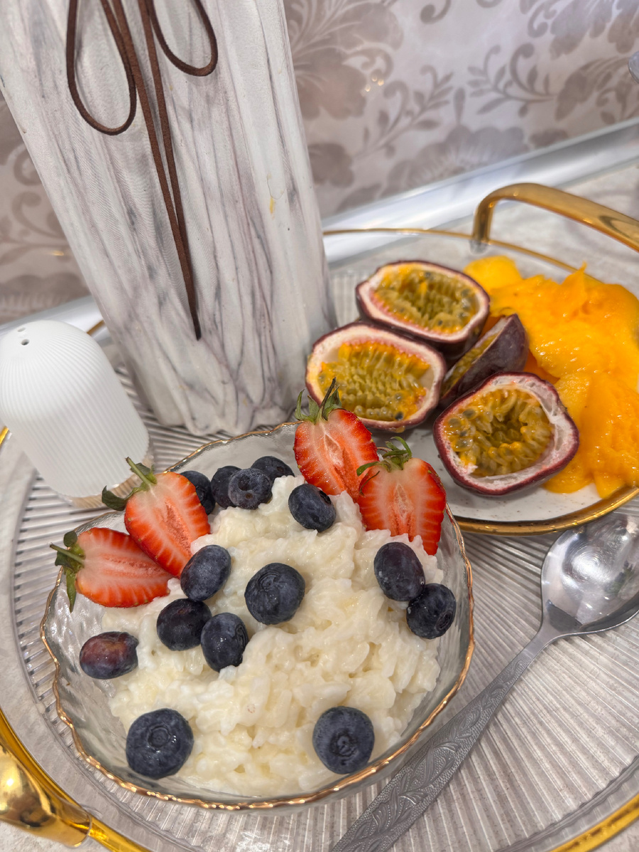 Я подавала кашу с голубикой и клубникой. В качестве десерта к каше еще было манго и маракуйя.