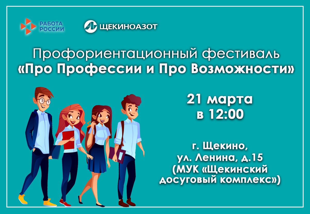 В профориентационном фестивале «Про Профессии и Про Возможности», который состоится в пятницу в Щекинском ДК, примут участие представители компании «Щекиноазот». Фестиваль организован кадровым центром «Работа России» Щекинского района для школьников 9-11 классов и пройдет 21 марта, начало - в 12:00. Программа фестиваля включает в себя знакомство с востребованными профессиями. Представители кадровой службы «Щекиноазота» расскажут о возможностях целевого обучения, сотрудничества с предприятием, о трудоустройстве на предприятие. Сотрудники образовательных учреждений Тульской области проведут презентации специальностей, по которым ведется обучение, расскажут об условиях поступления и раздадут информационные материалы.Специалисты центра занятости населения Щекинского района предложат школьникам пройти профориентационные тесты и поучаствовать в интерактивных играх. Основная цель фестиваля - помочь школьникам выбрать свой профессиональный путь, наладив связи между образовательным