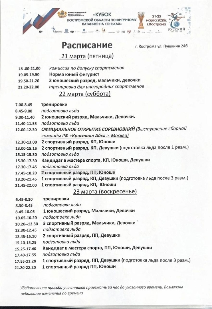 В областной столице стартуют престижные соревнования по фигурному катанию В Костроме с 21 по 23 марта пройдут соревнования на Кубок Костромской области по фигурному катанию на коньках. Зрителям также покажут невероятное выступление участников шоу Евгения Плющенко. Начало уже в субботу, в 12:00. В областную столицу для участия в соревнованиях приедут 200 спортсменов из десяти городов страны: Тулы, Москвы, Ярославля, Иваново, Новомосковска, Твери, Казани, Белгорода и Владимира. Московская команда синхронного катания «Кристалл Айс» станет специальным гостем соревнований. Она покажет уникальное шоу, которого Кострома еще не видела. Также на лед выйдут местные звезды — Екатерина Кольцова и Илья Попов. Состоятся соревнования по адресу: улица Пушкина, 24Б. Вход бесплатный. 0+