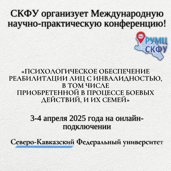 3-4 апреля 2025 года СКФУ станет площадкой для Международной научно-практической конференции «Психологическое обеспечение реабилитации лиц с инвалидностью, в том числе приобретенной в процессе боевых действий, и их семей». Организаторами выступают: Минобрнауки России, Северо-Кавказский Федеральный университет, РУМЦ СКФУ, РУМЦ ЮФУ, сеть РУМЦ ВО, РАО, Ассоциация инклюзивных вузов. Конференция пройдет в рамках деловой программы межвузовского регионального этапа чемпионата "Абилимпикс-2025". Цели мероприятия: - создание дискуссионной площадки для презентации результатов исследований, обмена российскими и зарубежными знаниями и опытом, а также обсуждения актуальных проблем и тенденций в области инклюзивного образования; - привлечение внимания общественности к современным проблемам реабилитации и трудоустройства лиц с инвалидностью и ОВЗ, в том числе участников СВО; - стимулирование научно-исследовательской деятельности преподавателей, педагогов образовательных организаций и студентов. К уча