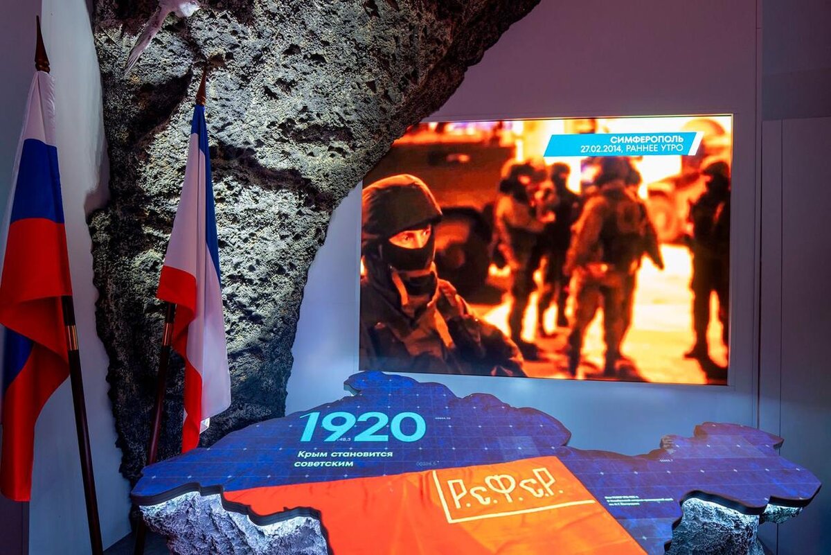 Среди экспонатов — символический макет крымского утеса с чайкой, флаги России и Крыма, а также стела с анимированным изображением бойца, который рассказывает о Крымской весне.