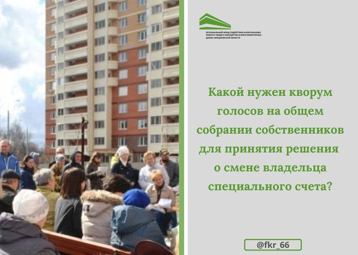 ❓ ВОПРОС: Какой нужен кворум голосов на общем собрании собственников для принятия решения о смене владельца специального счета? ✔ ОТВЕТ: Для принятия такого решения необходимый кворум голосов на общем собрании собственников составляет более пятидесяти процентов голосов (50%+1 голос) от общего числа собственников помещений в многоквартирном доме. Напомним, что владельцем специального счета на капремонт может быть: