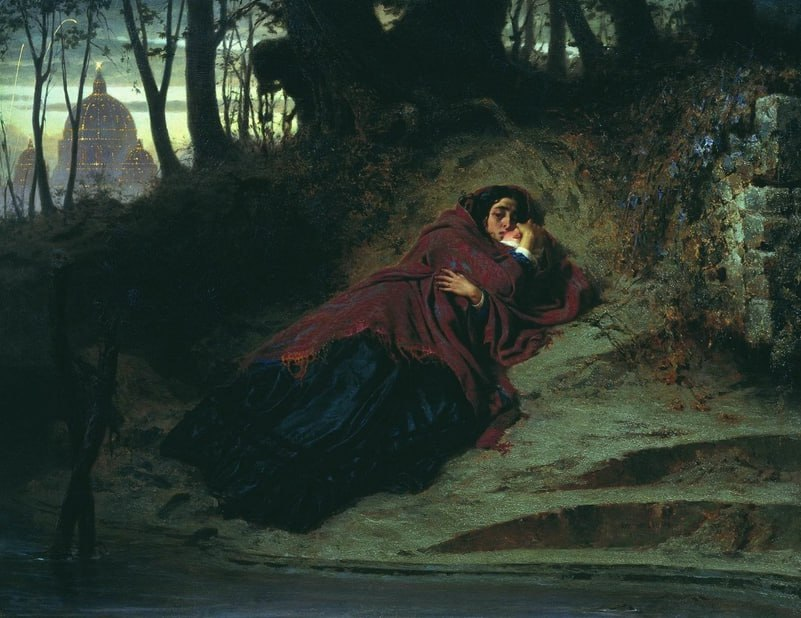 Рассвет над Римом оглашают звуки фейерверков. Но, как это часто случается, чей-то праздник совпал по времени с личным горем одинокого человека. Картина «Покинутая» написана Фёдором Бронниковым в 1873-м году. На голой земле возле опоры старого каменного моста лежит заплаканная женщина. В её объятьях крепко спит младенец, которого мама согревает дыханием и теплом собственного тела. Обручальное кольцо, по католической традиции надетое на безымянный палец левой руки, говорит о том, что неизвестная состоит в законном браке. Однако, судя по названию работы,глава семьи оставил и жену, и недавно рождённого малыша на произвол судьбы. В лощине где, прячась от позора, провели ночь несчастные, ещё клубится глубокий сумрак. Но даже он не мешает заметить, что красная накидка, которой укрываются мать и дитя, совершенно ветхая. У брошенной нерадивым супругом героини нет средств к существованию. Её мучает страх за будущее ребёнка. До зари она пролежала в тяжёлых раздумьях. От реки веет холодом, тоска т