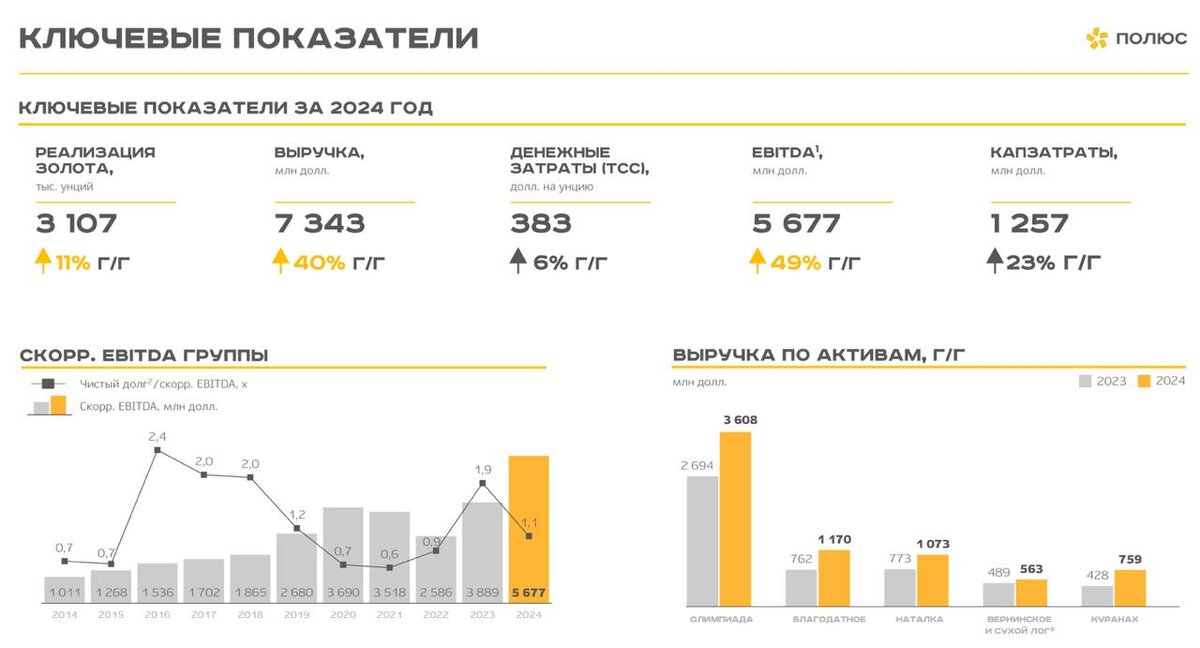 Геополитическая напряженность 2022-2023 годов и последующая за ней скупка золота Центробанками всего мира, привела в 2024 году к ралли на спотовом рынке. Котировки драгоценного металла выросли за 2024 год почти на 30% до $ 2600 за тр/ун. На этом рост не остановился и в начале 2025 года привел цену к $ 2900. Как все это отразилось на бизнесе Полюса? Итак, выручка компании за полный 2024 год выросла на 54% до рекордных 694,8 млрд рублей. Этому способствовала идеальная конъюнктура. Про раллирующие цены на золото я уже сказал. Также существенный буст получили и от курсовых переоценок - средний курс по году превысил 92 рубля за доллар. Еще одним важным элементом успешной работы в 2024 году стало увеличение объемов производства золота до 3 млн унций и объемов реализации на 11% до 3,1 млн унций, в том числе за счет реализации ранее накопленного золота. Ну а когда продавать излишки, как не сейчас? Тут я только могу похвалить Полюс. Сразу отмечу, что сама компания прогнозирует снижение объемов
