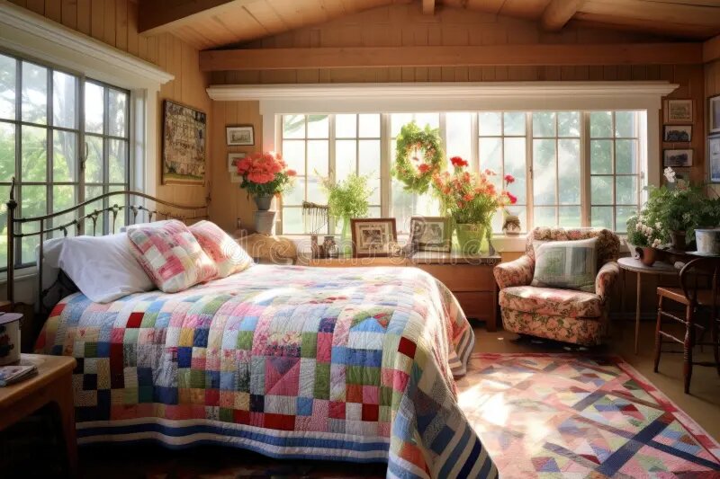 Возможно, лоскутное шитьё не сразу приходит на ум, когда речь заходит о декорировании современной спальни. Но, существует множество способов, как можно гармонично вписать лоскутный узор в современный интерьер. Одеяла — это, пожалуй, самый очевидный способ применить лоскутное шитье в интерьере, но и другие элементы, такие как ковры, шторы и произведения искусства, могут создать великолепный эффект. Лоскутное шитье может вызывать у вас некоторые опасения, особенно если вы ассоциируете его с бабушкиными одеялами из кусочков ткани или не совсем удачными идеями, связанными с джинсовой тканью. Однако в последнее время стиль пэчворк в интерьере снова становится актуальным, но в более утончённом и изысканном виде. Чтобы органично вписать его в интерьер, обратите внимание на сочетание тонов и текстур. Старайтесь использовать не более двух цветов или нескольких оттенков одного цвета, чтобы не перегружать пространство. Лоскутное шитье можно сочетать даже с другими узорами, не перегружая спальню