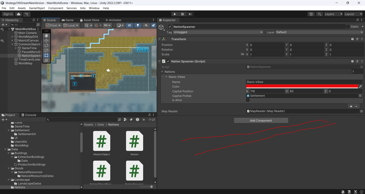 Разработка стратегии мечты – Nations. Создание наций. Приветствую, дорогие друзья! Продолжаем работу над нашей глобальной стратегией. В этой публикации мы создадим игровые нацию. Пока одну, но я планирую в игре несколько десятков наций. Итак с чего начать, конечно со скрипта – using UnityEngine; [System.Serializable] public class Nation { public string Name; // Название нации public Color Color; // Цвет нации public Vector3Int CapitalPosition; // Позиция столицы public GameObject CapitalPrefab; // Префаб столицы public bool IsAlive = true; // Жива ли нация public NationObjectRegistry ObjectRegistry = new NationObjectRegistry(); // Регистр объектов нации public Nation(string name, Color color, Vector3Int capitalPosition, GameObject capitalPrefab) { Name = name; Color = color; CapitalPosition = capitalPosition; CapitalPrefab = capitalPrefab; } } Что в этом классе присутсвует – Название нации, цвет нации (в этот цвет будут разукрашиваться границы и флаги нации), Vector3Int CapitalPosition