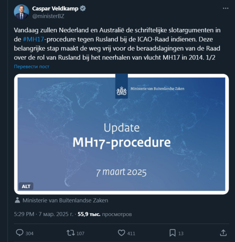 А перевод у него такой: "Сегодня Нидерланды и Австралия представят Совету ИКАО письменные заключительные аргументы по делу MH17 против России. Этот важный шаг открывает путь к обсуждению Советом роли России в крушении рейса MH17 в 2014 году."