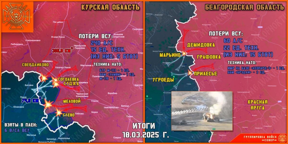 По мнению военкоров, командование ВСУ повело на очередную самоубийственную провокацию в русском приграничье. Они упорно пытались захватить хоть несколько метров российских территорий, на фоне переговоров по урегулированию конфликта президентов РФ и США. Все атаки были успешно отражены. За сутки противник предпринял шесть попыток прорыва в Краснояружском районе Белгородской области: четыре в направлении Демидовки и две около поселка Прилесье. Военкоры назвали эти штурмы «мысными». «В попытках пойти на штурм принимало участие свыше 200 солдат ВСУ из подразделений, участвовавших в Курской битве и наспех доукомплектованных за счет находящихся в резерве опытных ВСУшников, украинских пограничников и бывших заключенных», - - сообщили в телеграмм-канале. Они рассказали подробности, что для прорыва обороны российских войск враг задействовал 29 единиц военной техники, в том числе пять танков, 16 ББМ и БМП, три ИМР, установку дистанционного разминирования УР-77 и четыре автомобиля. Кроме того, в