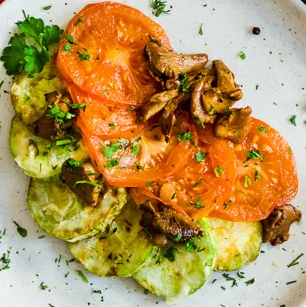 Ингредиенты: - 600 г кабачков - 300 г грибов - 4 помидора - 2 луковицы - 3 ст. л. растительного масла - соль - зелень петрушки - сметана Приготовление: Измельчите лук и грибы, обжарьте их и переложите в кастрюлю. Затем нарежьте кабачки кольцами и обжарьте их в растительном масле. После этого добавьте кабачки к грибам, посолите и долейте немного воды. Тушите всё вместе около 10 минут, после чего добавьте нарезанные помидоры и сметану. Продолжайте готовить до полной готовности. Перед подачей посыпьте блюдо свежей зеленью и подавайте с варёной картошкой.