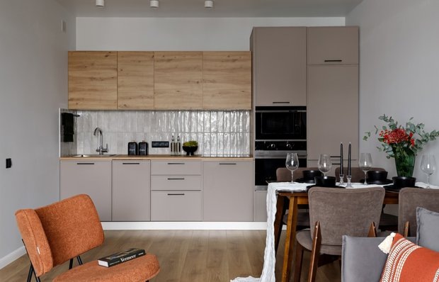 Секреты стильного оформления из проекта профи При создании интерьеров важно не только следить за модными тенденциями, но и умело сочетать материалы, цвета и элементы декора. Предлагаем простые и эффективные решения из проекта хоумстейджера Анастасии Дубовсковой, которые помогут сделать интерьер визуально дороже и солиднее. Одним из ключевых аспектов успешного интерьера является использование контрастов и сочетание различных материалов. Для создания объема применили разные текстуры: лен и хлопок в оформлении кровати и декоративные подушки букле в зоне отдыха в гостиной. Картины с имитацией штукатурки над диваном и контрастные оттенки дерева в отделке и мебели добавили интерьеру глубины и выразительности. Выбор цветовой палитры имеет огромное значение в восприятии пространства. Например, оливковый зеленый в сочетании с терракотовым создают эффектный контраст, который может быть трансформирован от светлых до насыщенных темных оттенков. Спальня в более светлом ключе выглядит свежо и уютно,