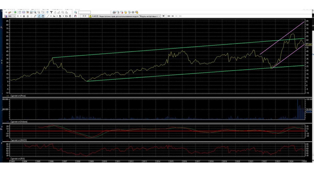 Недельный график показывает, что акция Сургутнефтегаз (п) располагается в слаборастущем тренде 26,0-62,2. Внутри тренда сформировался растущий коридор 54,0-85,0 и линия поддержки практически подошла к линии сопротивления тренда. Акция сделала ложный пробой в линии сопротивления тренда, и с апреля 2024 года началось движение возвращения к линии в слаборастущий тренд. К июлю акция достигла уровня 47,0 и сделала попытку к росту, достигнув линии сопротивления тренда. Медведи снова вернули акцию в марте 2025 года к линии поддержки растущего коридора, с попыткой пройти ее. Индикатор RSI сверху приблизился к уровню 40% и старается перейти в горизонтальное движение. Индикатор MACD снизу подошел к нулевому уровню и перешел в горизонтальное движение. Объем торгов показывал высокую активность инвестора в акции, позже пошел процесс падения активности. Учитывая показания индикаторов RSI, MACD и объема торгов медведям, не получится пройти линию поддержки растущего коридора, потому что индикаторы не хотят идти вниз.