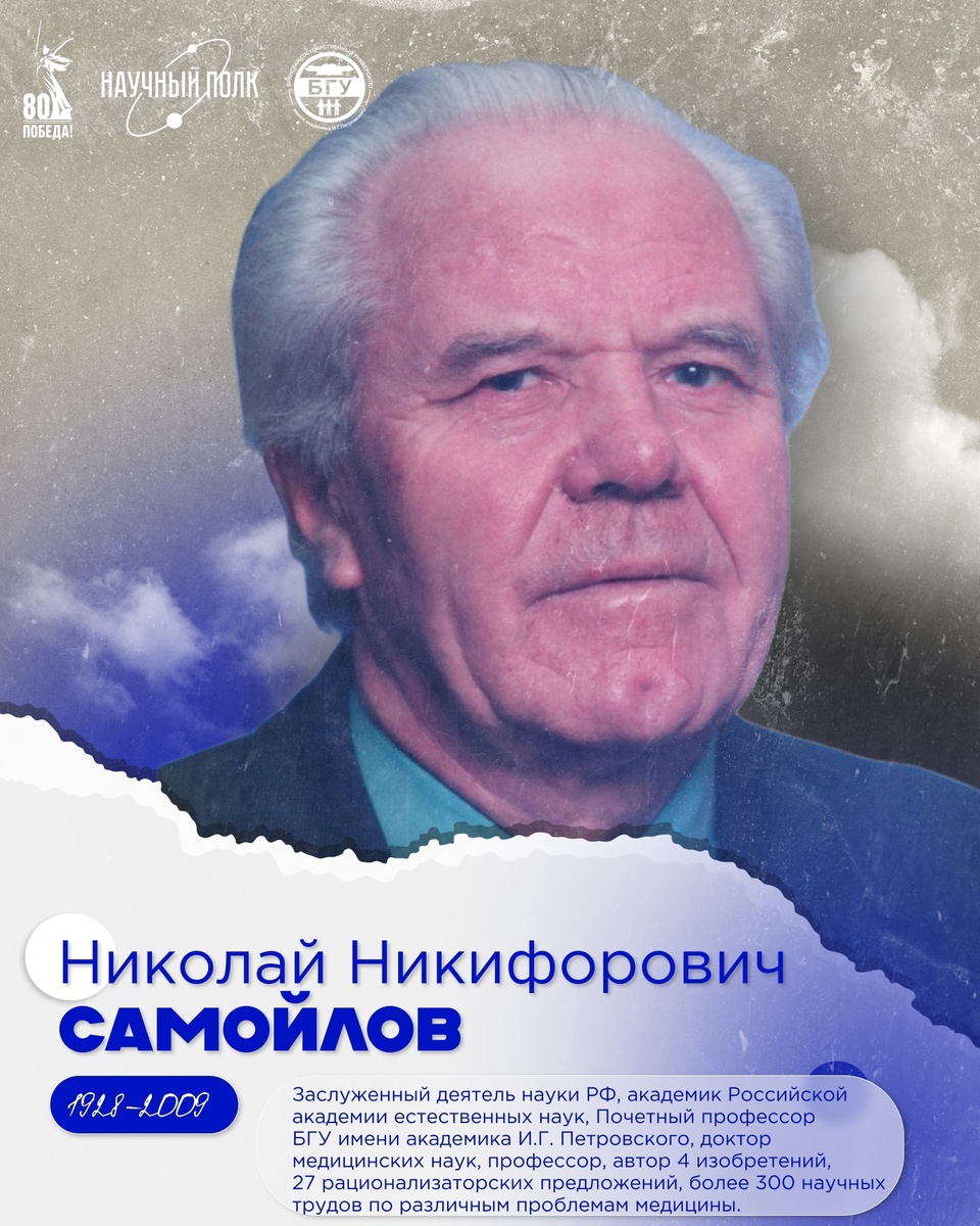 Заслуженный деятель науки РФ, академик Российской академии естественных наук, Почетный профессор Брянского государственного университета имени академика И.Г. Петровского, доктор медицинских наук, профессор, автор 4 изобретений, 27 рационализаторских предложений, более 300 научных трудов по различным проблемам медицины. 🔹В годы Великой Отечественной войны Николай Самойлов был еще подростком. Наравне со взрослыми трудился в колхозе в Оренбуржье. Затем была служба на военно-морском флоте, учеба в фельдшерско-акушерской школе и Военно-медицинской академии. 🔹Значительная часть жизни связана с ВМФ: военный врач морского флота Н.Н. Самойлов бороздил акваторию Тихого океана, «лежал на грунте» под Вьетнамом, Индонезией, преподавал на кафедре военной гигиены и военной эпидемиологии Военно-медицинского факультета Томского медицинского института и кафедре военной подготовки Винницкого медицинского института. Награжден медалями «За доблестный труд в Великой Отечественной войне 1941-1945 гг.», «За