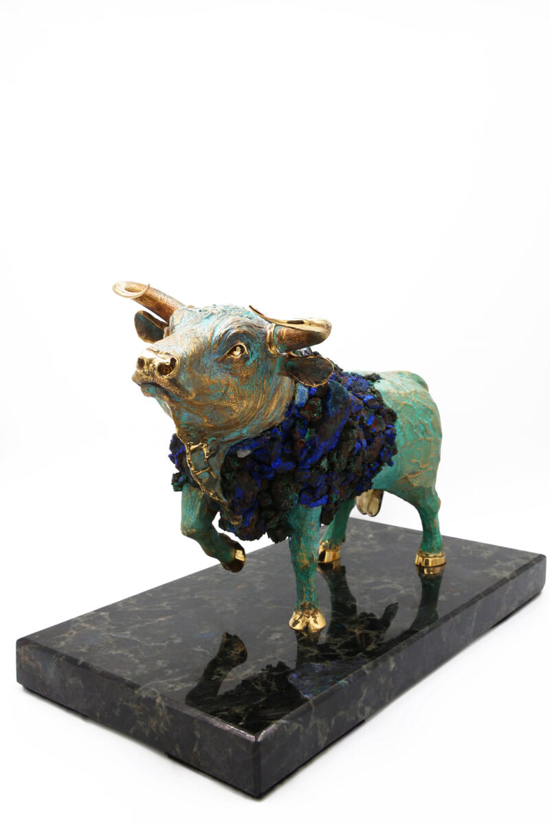 Тибетская легенда гласит, что под землёй обитает голубой бык — ипостась бога Земли. И если найти его храм, мифическое животное исполнит все Ваши тайные мечты. В традиции фэн-шуй голубой бык имеет схожее значение. Он приносит в жизнь стабильность и плодородие. К нему можно обращаться за исполнением тех желаний, которые могут казаться недостижимыми. Основа быка создана из бронзы — сплава, интегрирующего энергию и укрепляющего человеческую духовность и стойкость. Покрытие — римская патина. Раскрыть энергию помогает голубовато-зелёное свечение азурмалахита, которое снимает внутренние блоки, смягчает переживания и дарит душевное равновесие. “Достоинства” быка сделаны из раухтопаза (дымчатого кварца, 60 карат) — «священного камня Будды», помогающего достичь просветления и спокойствия. Свойства камней подчёркивает подставка из лабрадорита. Эта скульптура — символ комфортной жизни, в которой Вы реализовываете все свои желания и мечты. И её появление в доме — долгожданный и ценный момент, кото