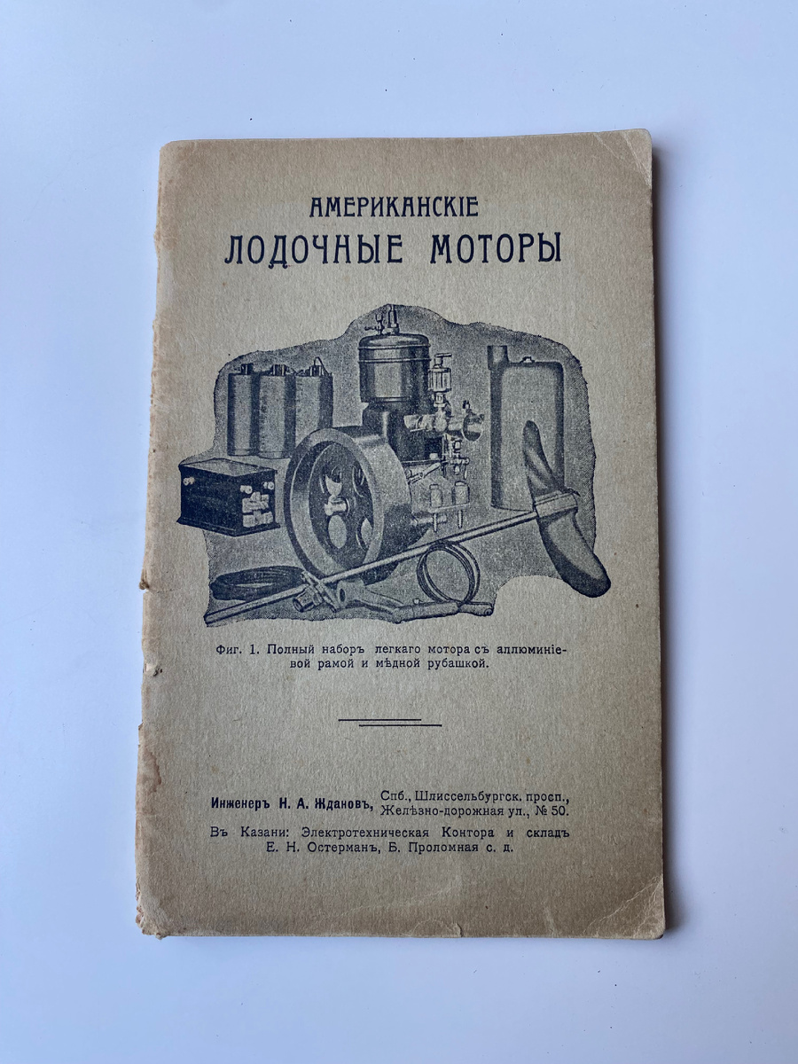 Попалось интересное издание 1908 года «Американские лодочные моторы». Очень редкая книжка, в интернете нет никаких фотографий или упоминаний на данный момент, кроме того что такой экземпляр есть в фондах РНБ.