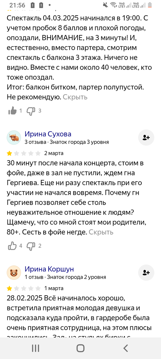 Это просто выборочно. Отдельная тема это цены. Это хамство работников. Это неудобные места и сидения. Отсутствие нормального питания, нормальных туалетов,а люди едут с работы, издалека. Опоздания Гергиева, отмечу,что все заметили,что он никогда и ни разу не приходил вовремя. Ужасное исполнение, т к всех хороших артистов выгнали. Пожалуй, я лучше дома на диване посмотрю записи и трансляции лучших театров мира. Мне жаль и пятьсот рублей на Мариинский,который давно пробил дно, ещё до пандемии. Гергиев это из компании бегловской криминальной шайки,которые испоганили мой родной город. Отмечу,что ни образования, ни умений у Гергиева нет и не было,он ноль без палочки,сумевший вовремя пролезть по головам,как любой провинциал. И жена у него такая же. Хотя он не только по девочкам,отчего спелся с Цискаридзе и властью. Бедный,бедный мой культурный Петербург. P.s. отзывов и мнений полно на любой вкус и на всех независимых ресурсах. Фанатки этой бездарности могут от меня отписаться, а не