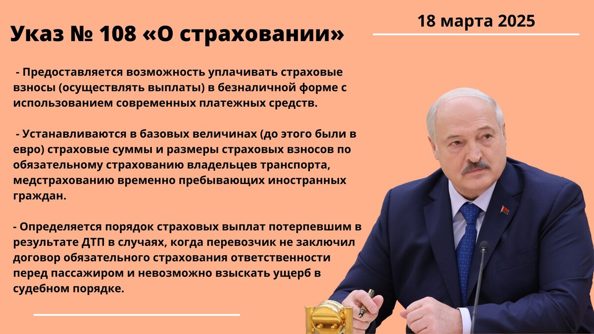 Глава государства подписал Указ «О страховании». Вот какие новшества ждут белорусов👇🏻 📌Теперь страховые взносы можно уплачивать в безналичной форме. 📌Страховые суммы и размеры страховых взносов по обязательному страхованию теперь устанавливаются в базовых величинах, а не евро, как это было ранее. 📌Определен порядок стразовых выплат пострадавшим при ДТП, если водитель не заключил договор обязательного страхования ответственности перед пассажиром и невозможно взыскать деньги за причиненный ущерб через суд. 📌Также водители смогут рассчитывать на выплаты от гарантийных фондов при ДТП с участием диких животных. Но только в том случае если была угроза жизни и здоровью. 📌Если человек заключил договор страхования от несчастных случаев на производстве, то «Белгосстрах» будет взыскивать с виновных определенные суммы – при причинении вреда умышленно - 2 тыс. базовых величин, без умысла - 500). Подписывайтесь –@prezident_lucashenko_reshaet