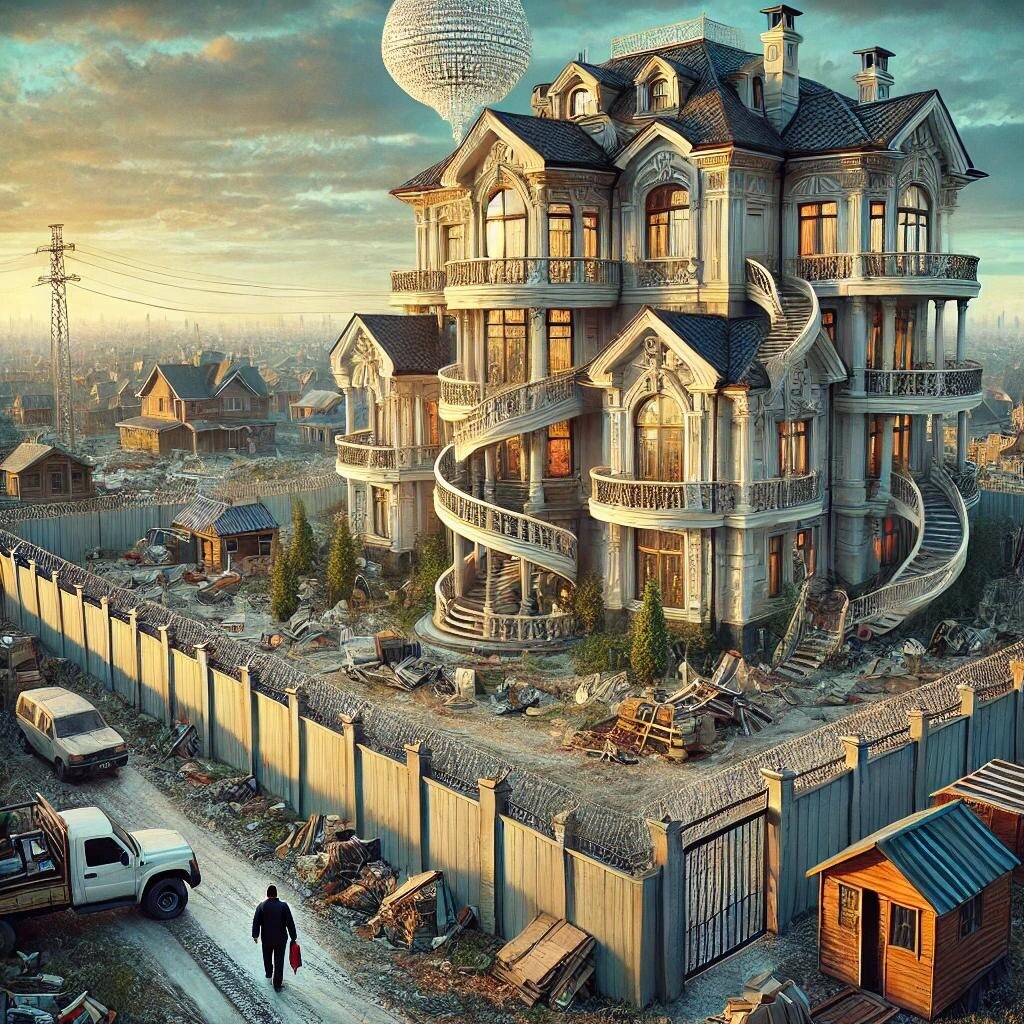 С одной стороны, живет дядя Петя. Он посмотрел обзоры блогеров на Ютюб вещающих о том, что можно построить дом за 1-2 миллиона, и поставил курятник из говна и палок несуразной формы. Посреди участка стоит то ли вагон, то ли будка, которую Петя называет домом. Рядом валяются строительные материалы, так на всякий случай, а то мало ли завтра крышу сорвет или стены поедут, что бы быстро подлатать. Забора нет. Весь строительный мусор разлетается по окрестностям от ветра. Петр работает водителем на Газели, его участок это одновременно и парковка, и автомастерская. Поэтому каждое утро он будет тарахтеть и ху@рить Вам выхлопными газами в окно. На праздники Вы будешь слышать гул пьяной толпы орущей под окнами, шансон всех авторов нашей эстрады и «тащиться» от запаха шашлыка.