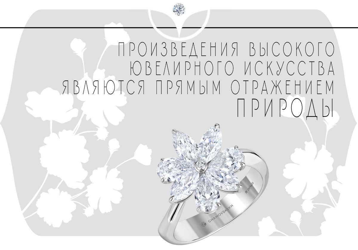 Цветок – истинное воплощение эфемерной красоты природы и ее совершенства, интерпретируемый в ювелирных произведениях самыми разными способами. Украшения Дома CHAMOVSKIKH, вдохновленные флорой, отражают не только реализм с его лаконичностью в простоте линий, но и абстрактное выражение ботанических форм, уверенно заявляя, что тема природы далека от обыденности. По своей сути, произведения высокого ювелирного искусства являются прямым отражением природы. Ведь в них представлены драгоценные камни и самоцветы, которые формировались в недрах планеты на протяжении тысячелетий. Подобно тому, как цветы способны очаровывать разнообразием форм и оттенков, так и драгоценные камни способны восхищать своим исключительным сиянием и цветом. Природа и технологии, эти понятия не противоречат друг другу, считают эксперты CHAMOVSKIKH. Именно поэтому в коллекции Invisible Inlay так много украшений с флористическими мотивами. При создании коллекции ювелирный дом использовал сложнейшую «невидимую» закрепку д