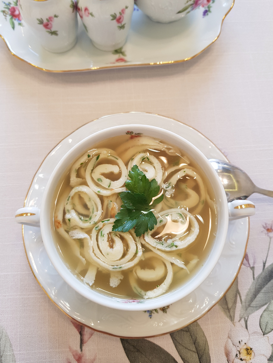 Добрый день, дорогие друзья! Сегодня я представляю вашему вниманию нежное, насыщенное, оригинальное блюдо от Огюста Эскофье, которое готовится на основании куриного консоме с добавлением соленых блинов в качестве гарнира. Для приготовления нам понадобятся: 250 грамм муки, 4 яйца, 500 грамм молока, 5 грамм соли, 1 столовая ложка подсолнечного масла, зелень петрушки, 1,5 литра куриного консоме. Приготовление: яйца разбить в ёмкость, добавить соль, перемешать. Добавить молоко, перемешать. Просеять муку. Перемешать миксером до однородности и оставить на 30 минут при комнатной температуре. Добавить растительное масло. Добавить мелко нарезанные листочки петрушки. Перемешать. Налить на разогретую сковороду тесто, распределяя его по дну. Выпекать на среднем огне с двух сторон до готовности. Готовые блины складывать на блюдо и накрывать баранчиком, чтобы они не остыли. Свернуть готовый блин трубочкой. Нарезать блинчик мелкой соломкой. Разложить соломку из блинчиков по бульонницам и залит