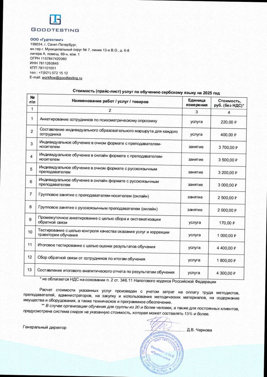 Уважаемые коллеги! Предлагаем организацию корпоративного обучения сербскому языку для вашей компании. Почему стоит выбрать наше обучение? • Профессиональные преподаватели с опытом работы в корпоративном обучении (русскоязычные преподаватели и носители языка). • Индивидуальный подход к каждой компании: мы адаптируем программу под ваши потребности и цели. • Гибкий график занятий, который удобно вписывается в рабочий процесс. Что мы предлагаем? • Разнообразные форматы обучения: очные, онлайн и смешанные. • Программы для разных уровней: от начинающих до продвинутых. • Возможность проведения курсов на вашем предприятии или в нашем центре. Прилагаем наш прайс-лист с подробной информацией о курсах и ценах. Для получения дополнительной информации и записи на обучение, пожалуйста, свяжитесь с нами по телефону +7 960 246 04 23 или по e-mail workflow@goodtesting.ru.