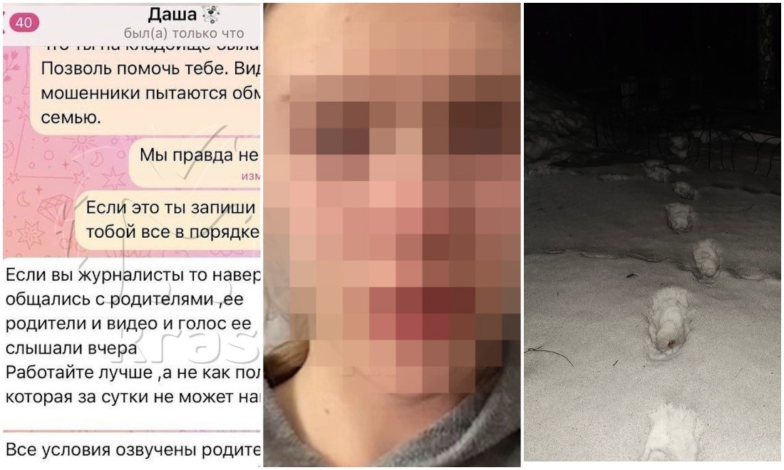 С 15-летней Дашей из города Ачинска, которая пропала 18 марта, попытались связаться журналисты телеграм-канала Kras Mash. Вместо девочки ответили её предполагаемые похитители. Один из них заявил, что хочет, чтобы школьница «вернула то, что забрала» и компенсировала моральный ущерб. Вслед за этим в сети появилось ещё одно видеообращение девочки. Как говорит в кадре сама Даша, запись сделана 19 марта в 12:45. Плачущая девочка в кадре утверждает, что с ней всё в порядке, говорит, что соскучилась по родителям и хочет домой. По данным ТАСС, следователям удалось выяснить, что первое видеообращение Даша записала на кладбище, куда приехала на такси совершенно одна. Оперативники допросили таксиста, который подвозил девочку. Он рассказал, что в пути она пользовалась наушниками и телефоном, но ни с кем не разговаривала. В 15 часов 19 марта в СК сообщили, что сотрудники полиции нашли Дашу на съёмной квартире в Назарово. Она жива. С ней всё в порядке. В ближайшее время девочку доставят в отделение