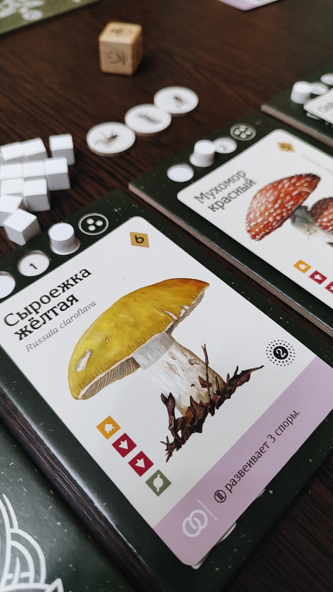 Далее... В игре нет как такового чёткого условия окончания партии, точнее, оно есть, нужно разложить по одному грибу под каждым планшетом игрока, но никто не ограничивает вас в количестве разлагаемых грибов под каждым планшетом. Получается, что игра закончится, как только игрок разложит пятый гриб под последним пустым планшетом, но сделать это он может абсолютно в любой момент игры. И когда именно это сделать, решит игрок сам, как только почувствует, что наигрался, или поймает момент превосходства по очкам всех остальных участников. Любите долгие партии? Выращивайте грибы, пока колода не закончится. Хотите определенности? Придумайте какое-нибудь общее правило для всех игроков, которое внесет ясность в процесс её окончания и ограничений. Нравится азарт и неожиданность? Оставьте всё как есть и спокойно играйте, пока кто-то один не решит завершить партию на своих, скажем так, условиях.